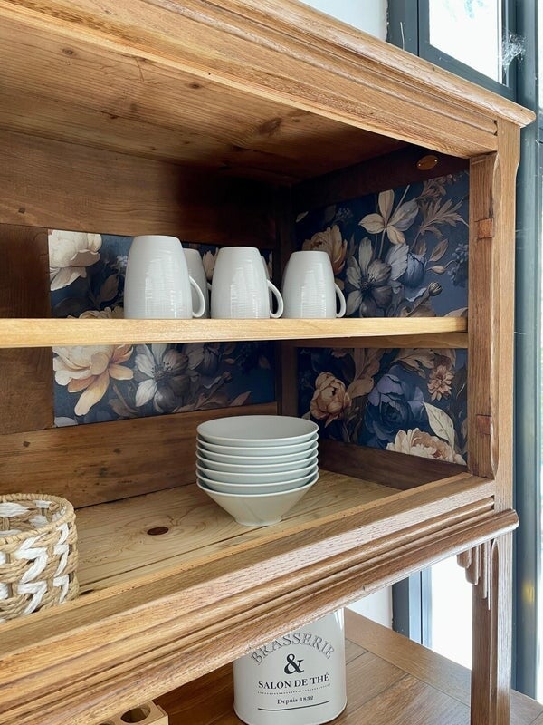 Buffet ancien en chêne massif soigneusement rénové et modernisé avec un papier fleuri dans les tons bleu et beige.