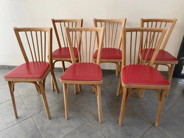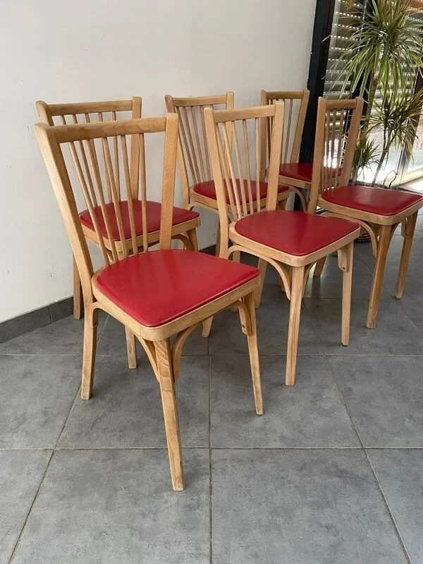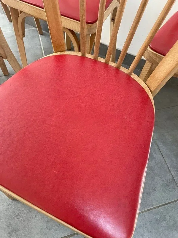 Ensemble de 6 chaises bistrot estampillées Baumann en similicuir rouge, entièrement poncées et vernies.