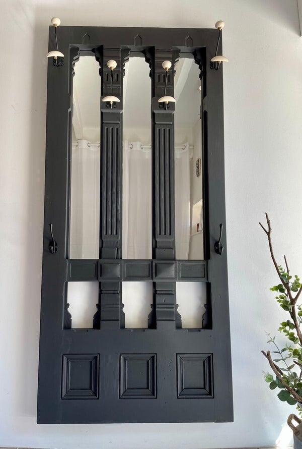 lourde) revisitée en vestiaire très fonctionnel avec ses nombreuses patères. Un immense miroir a été ajouté sur la partie haute. Deux crochets permettent d'accrocher sacs, clés, parapluies...