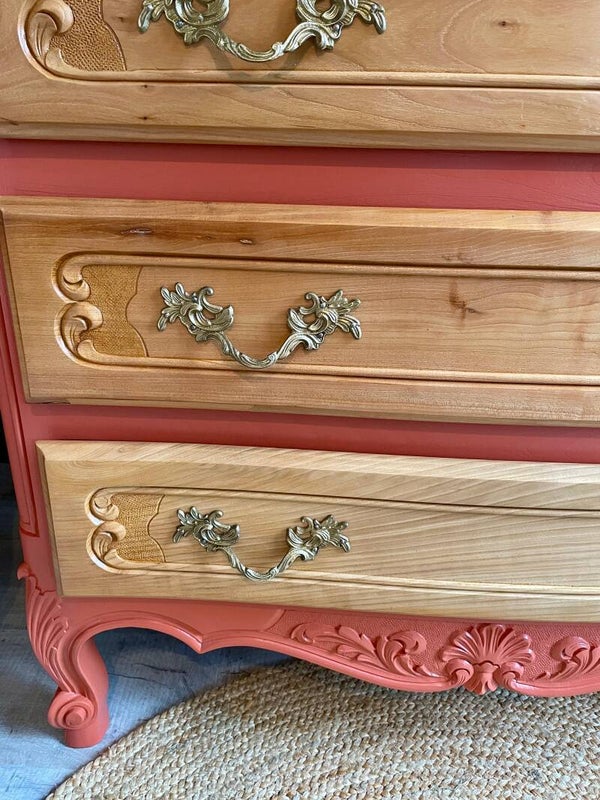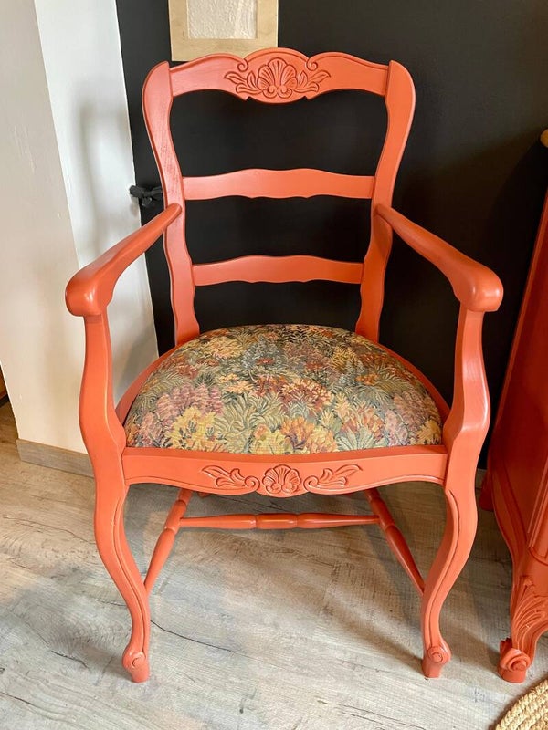 Bel ensemble composé d’une commode en merisier et de deux fauteuils assortis, relookés couleur terracotta. Pour une déco vintage mais au goût du jour. S’intégrera dans une chambre ou un salon pour une touche colorée.