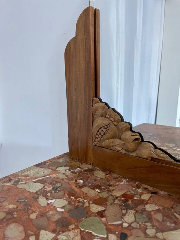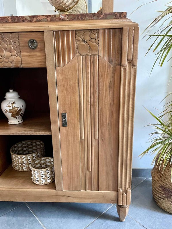 Magnifique buffet ancien au style Art Déco, en noyer massif sculpté avec des motifs de fruits. Le dessus est en marbre véritable (3 cm d’épaisseur ) en très bon état, et il est surmonté d'un grand miroir biseauté qui apporte du charme et de la lumière.