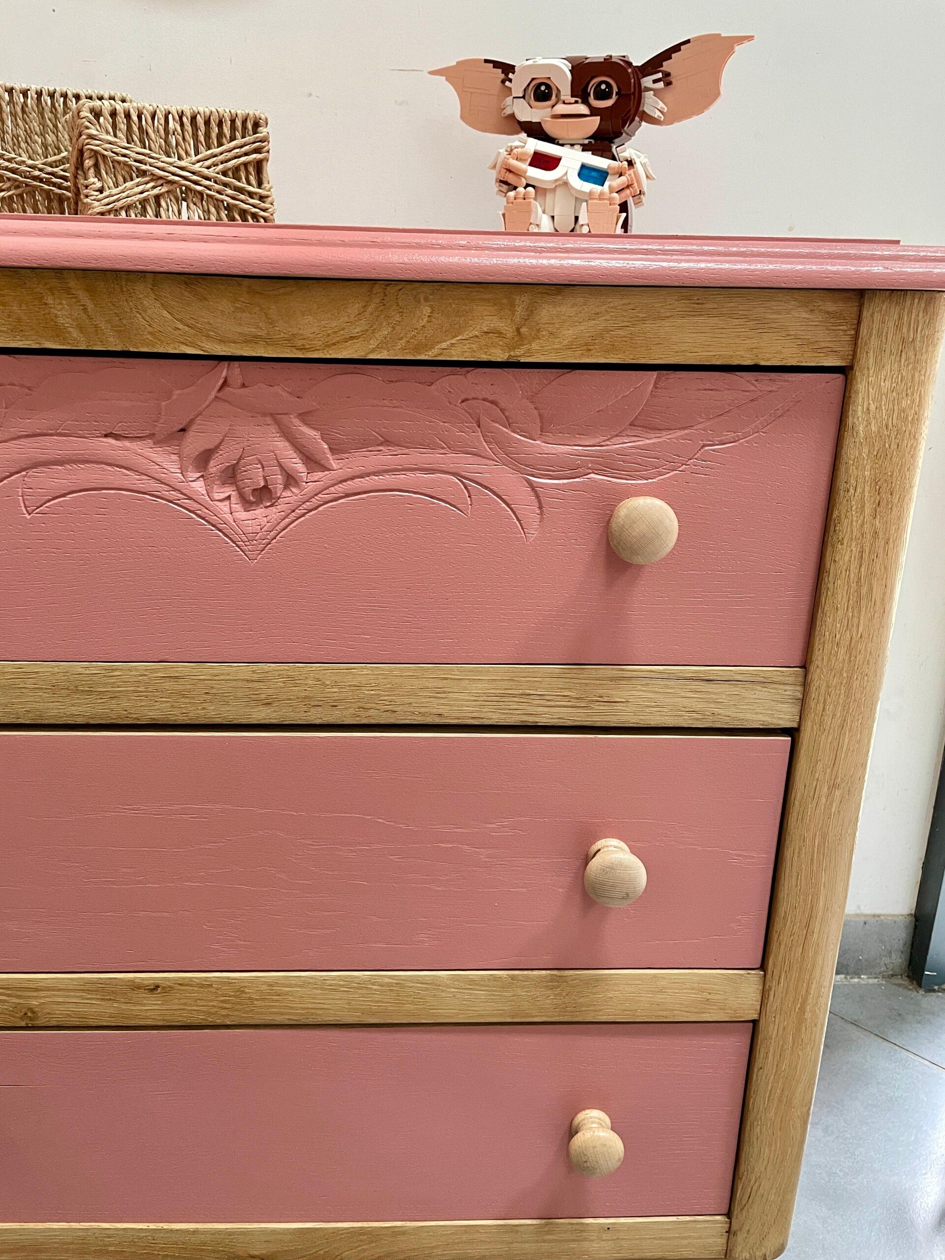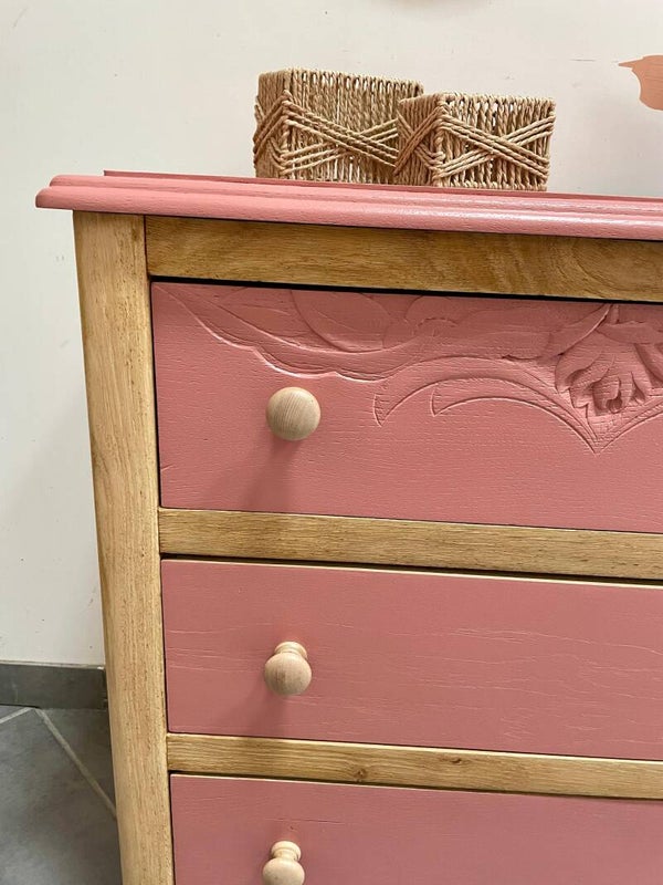 Jolie commode ancienne art déco en chêne relookée dans un coloris rose bonbon très féminin.