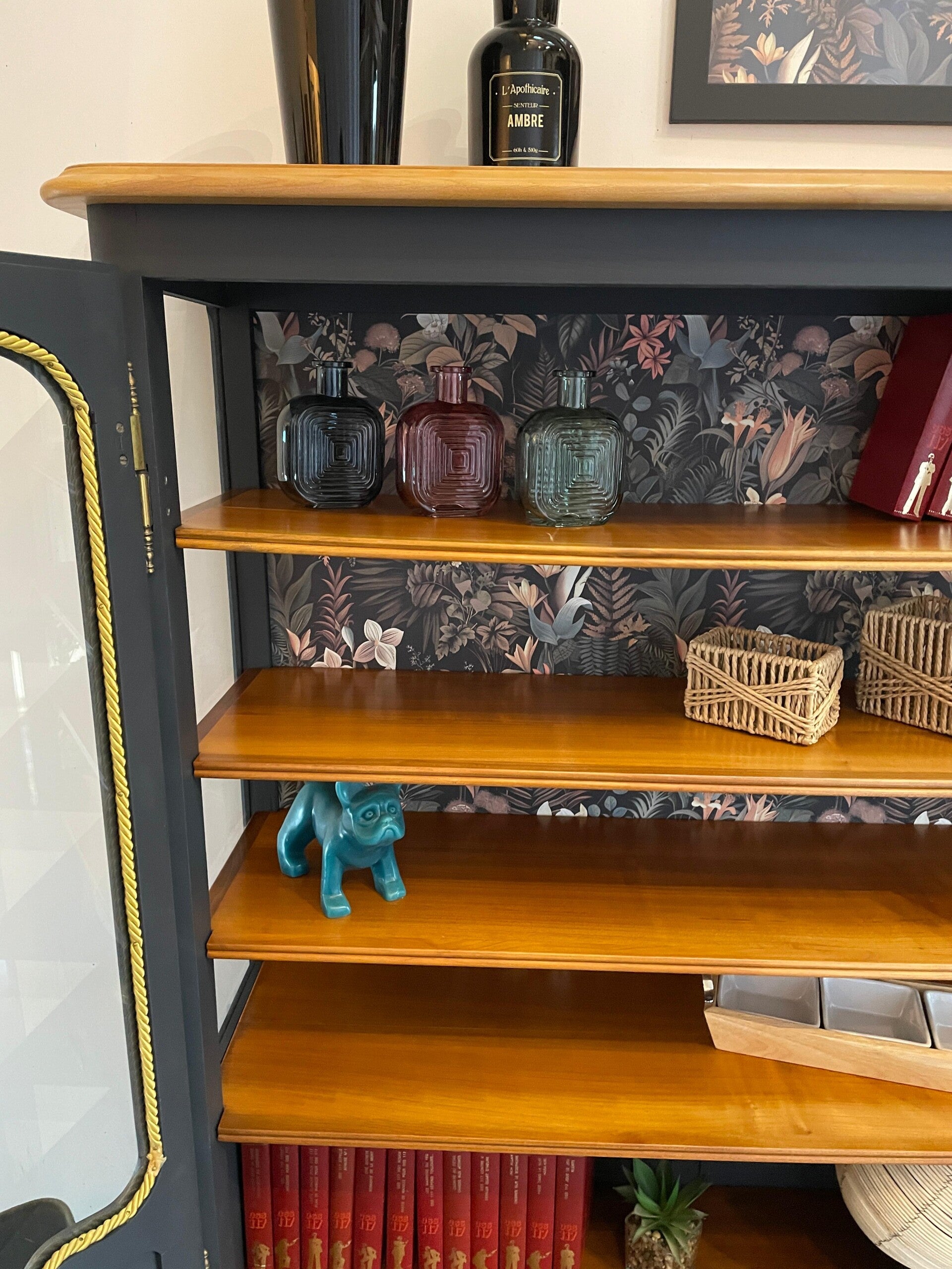 Bibliothèque / vitrine en merisier modernisée dans une teinte gris anthracite mat et agrémentée d’un joli papier peint. La peinture a été protégée par un vernis mat incolore. Le cadre assorti est offert.