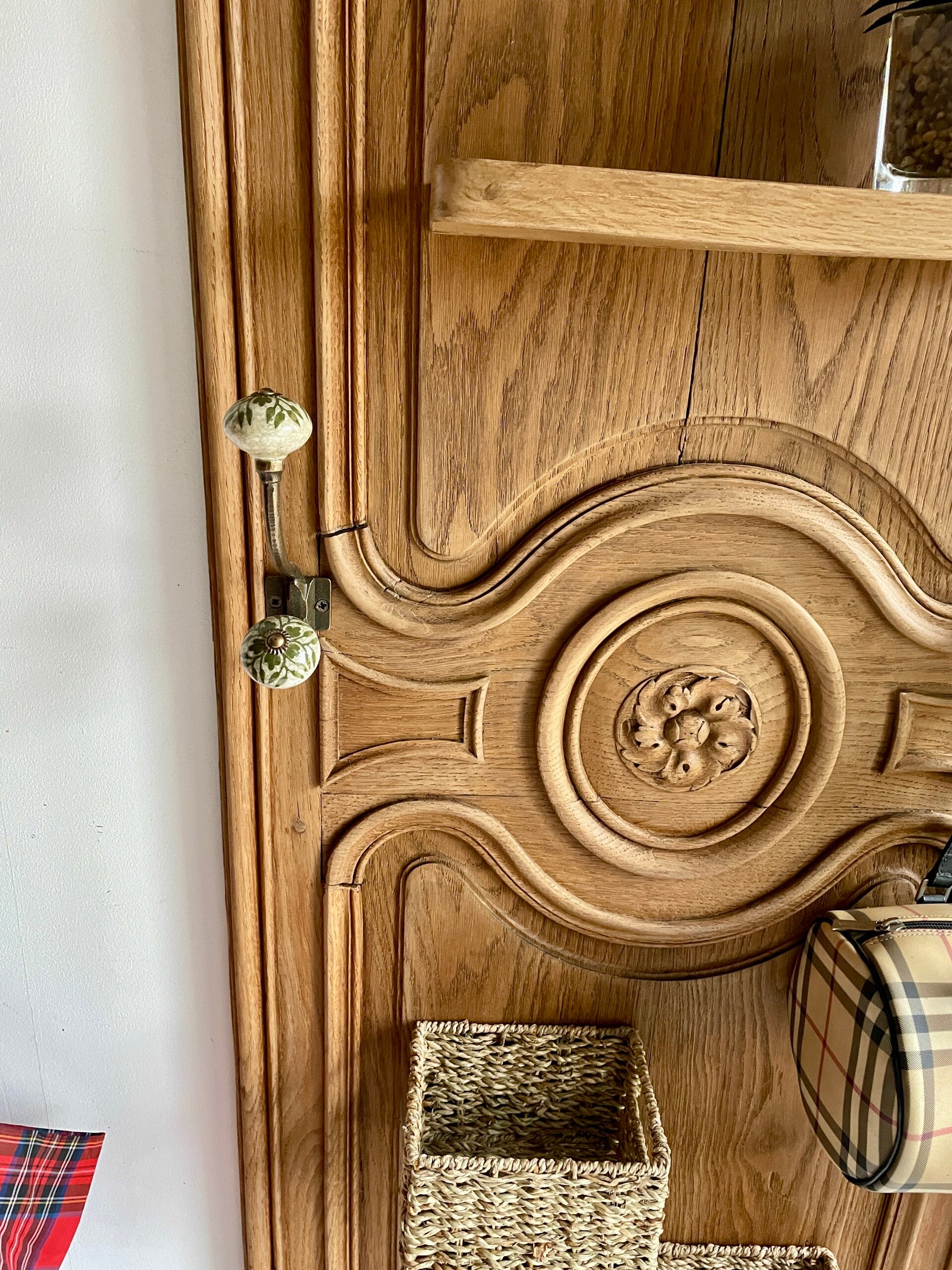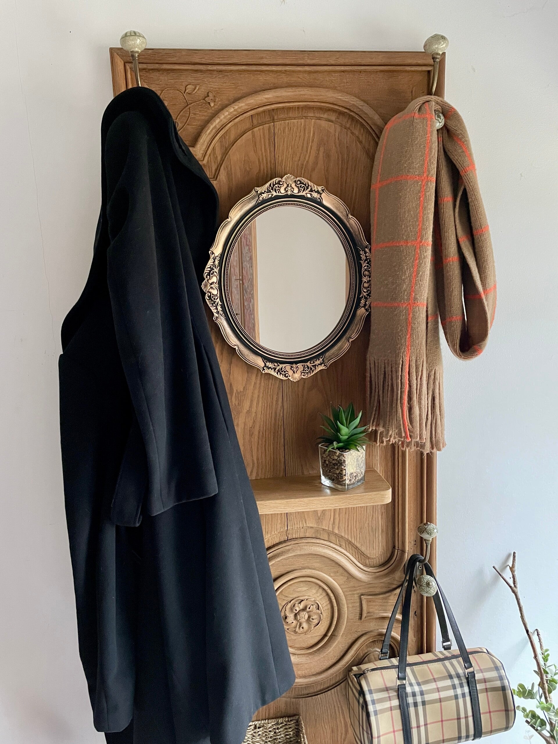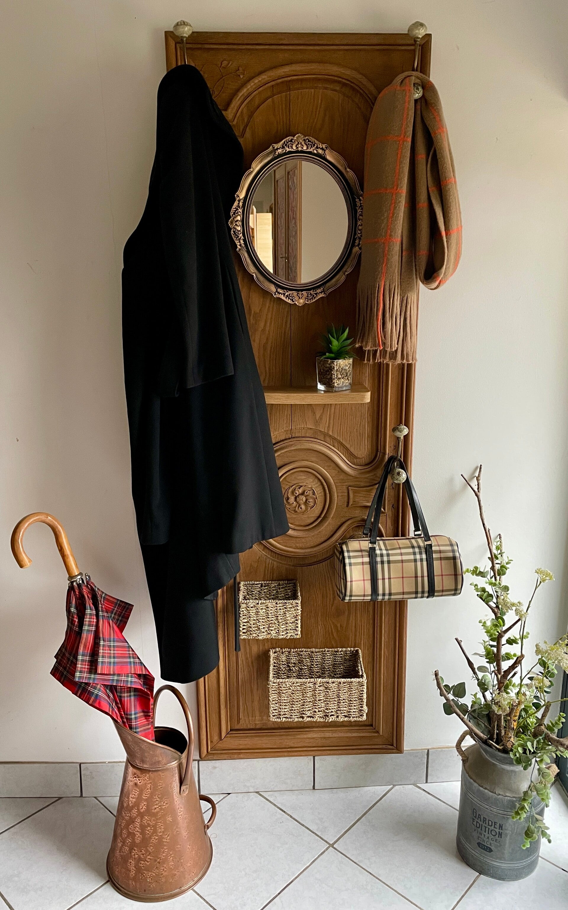 Porte en chêne massif d’une ancienne armoire et aux jolis motifs sculptés revisitée en dressing d’entrée.