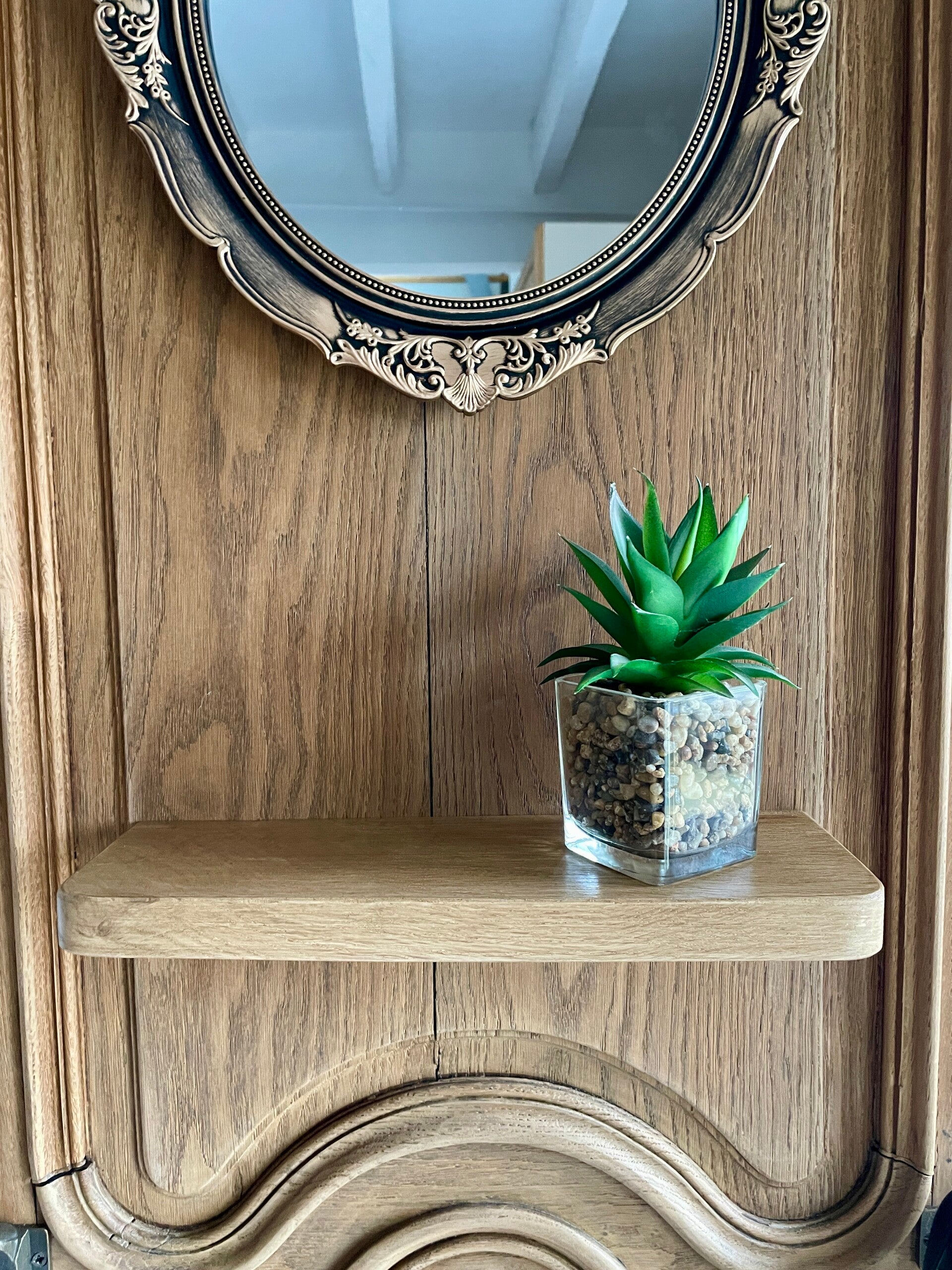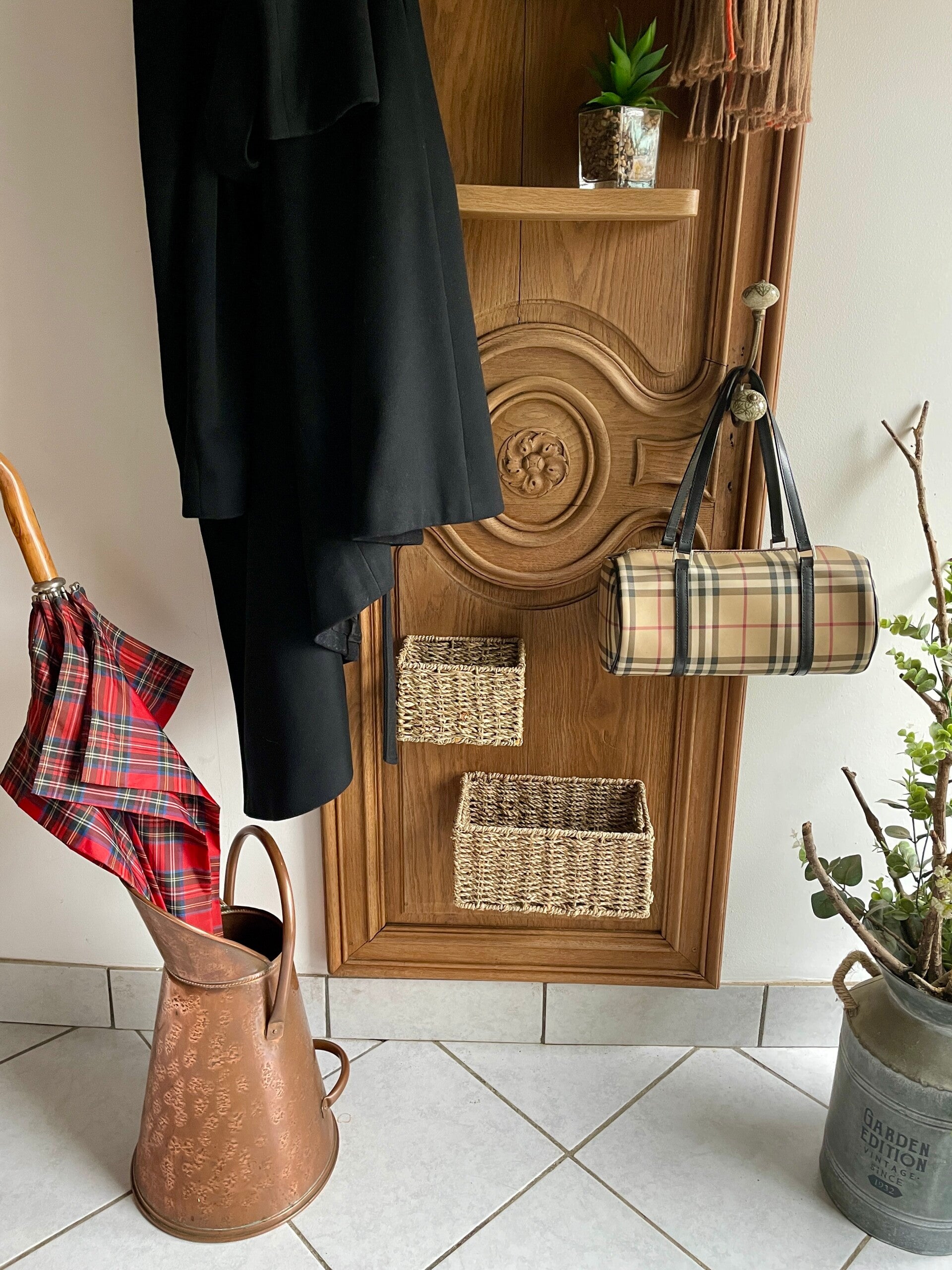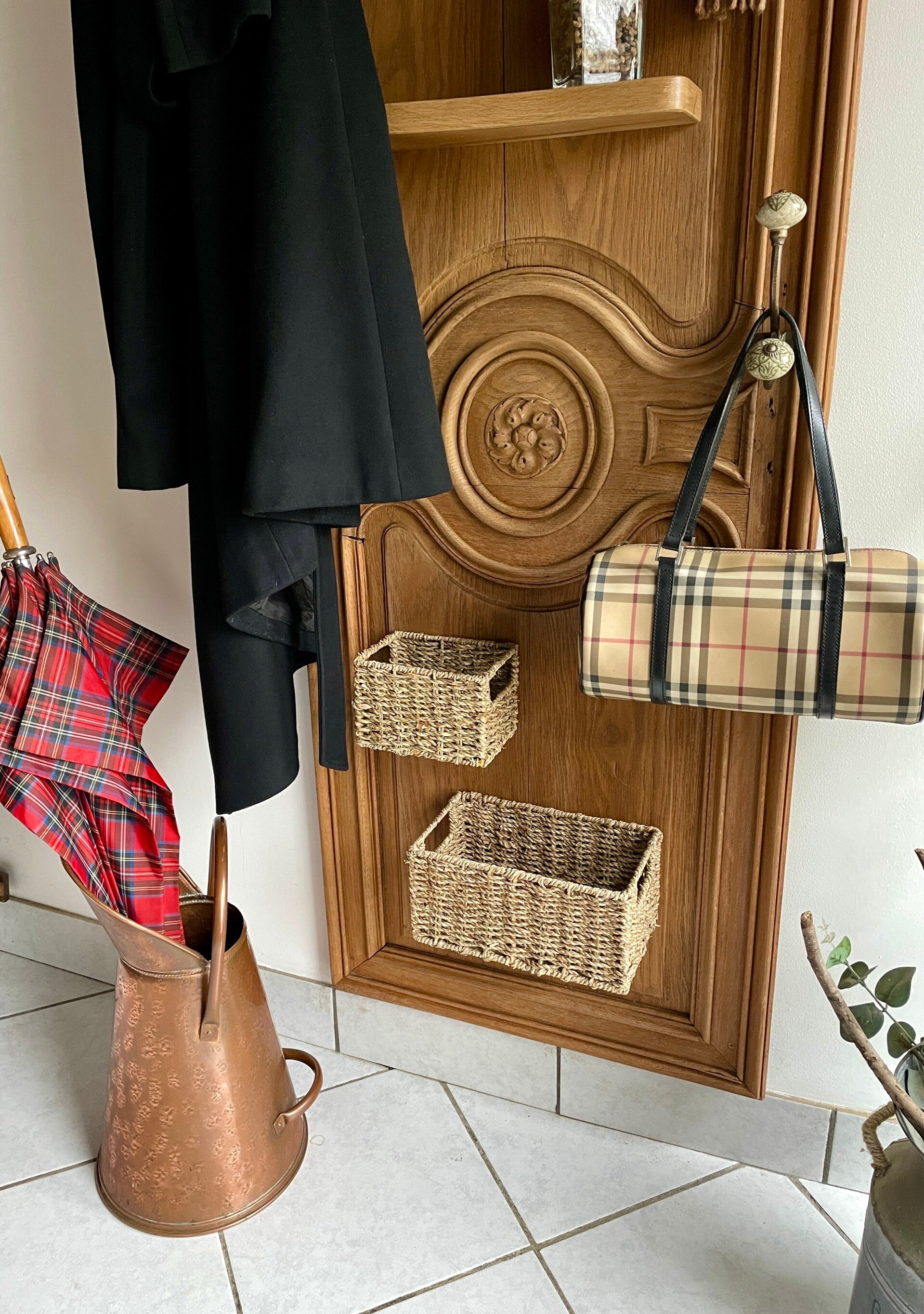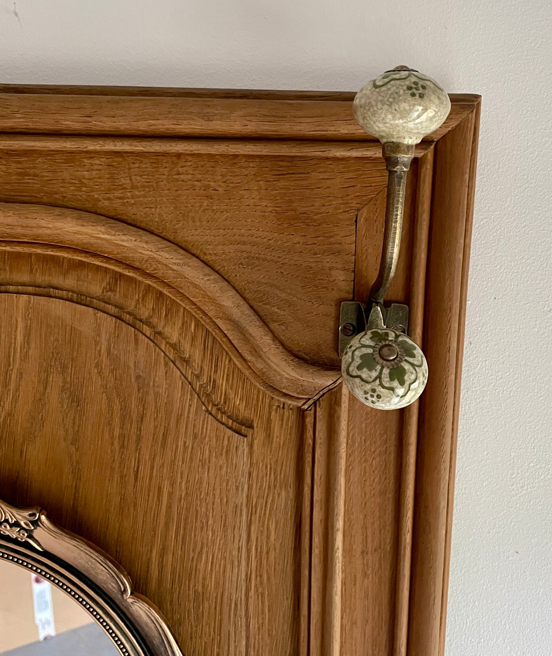 Porte en chêne massif d’une ancienne armoire et aux jolis motifs sculptés revisitée en dressing d’entrée.