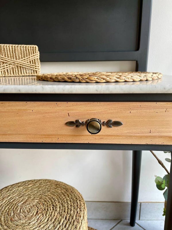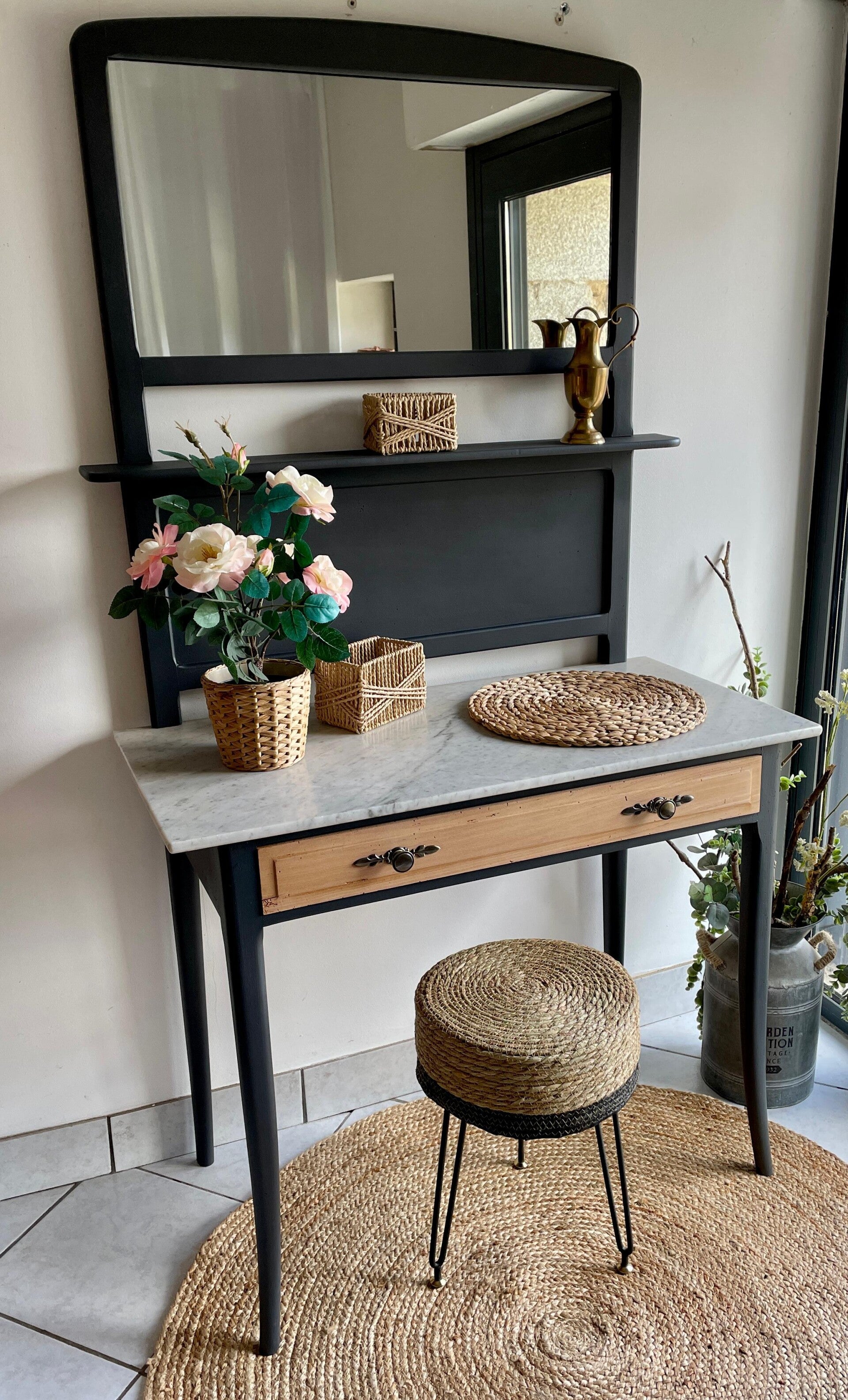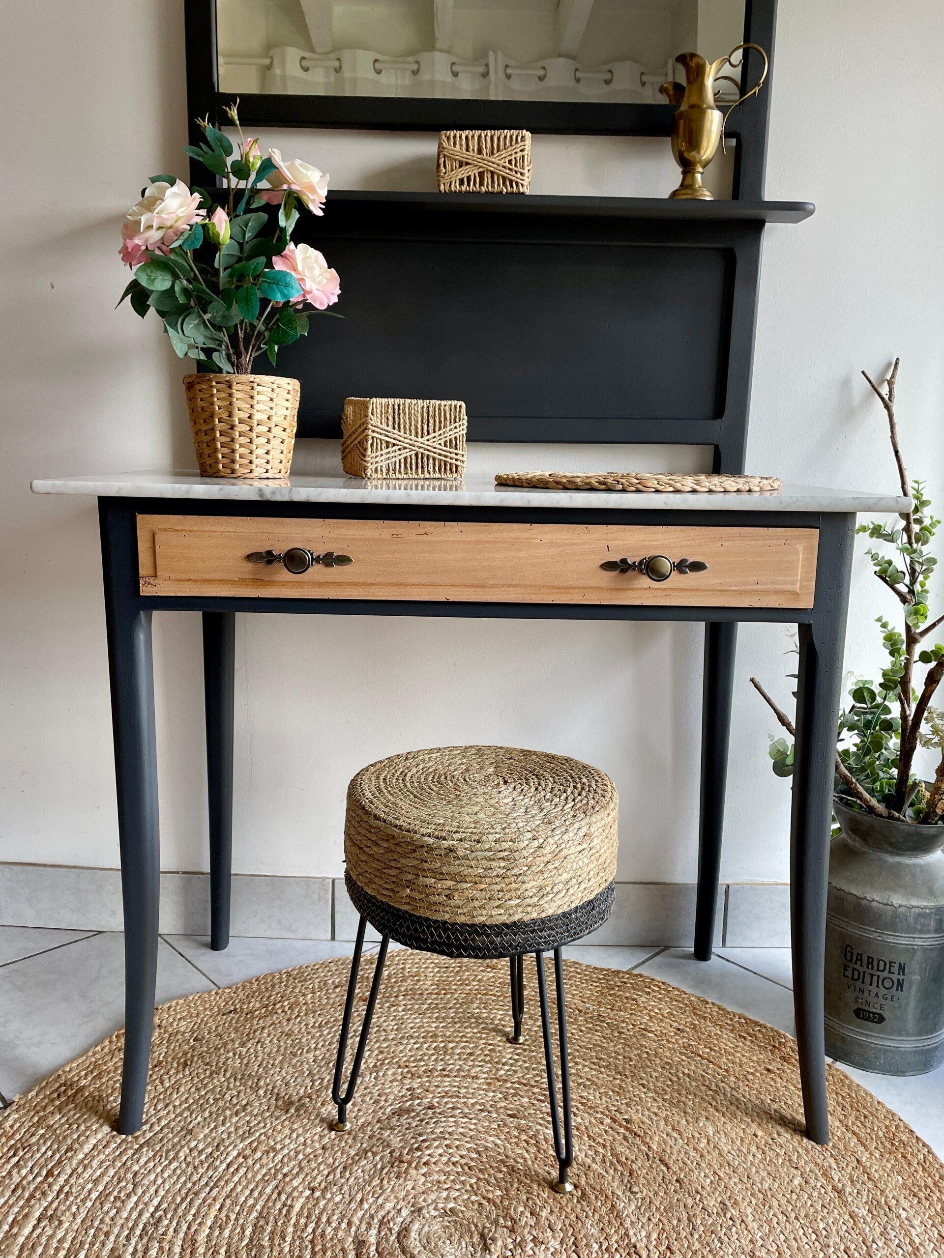 Console d’entrée remise au goût du jour dans un coloris actuel gris anthracite mat, mettant en valeur son marbre blanc au veinage gris.