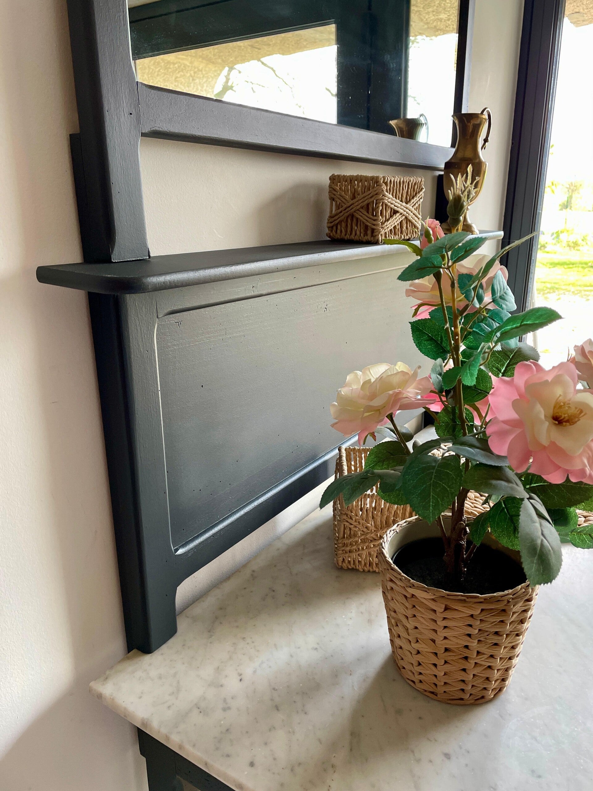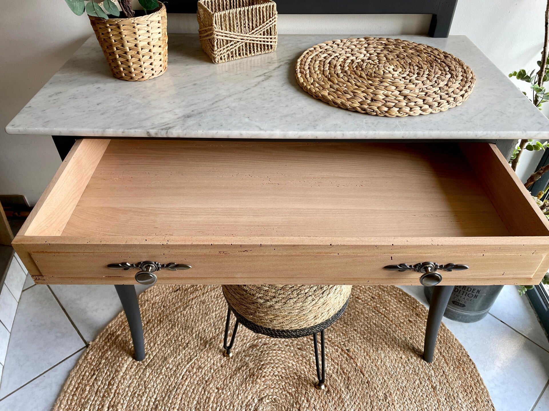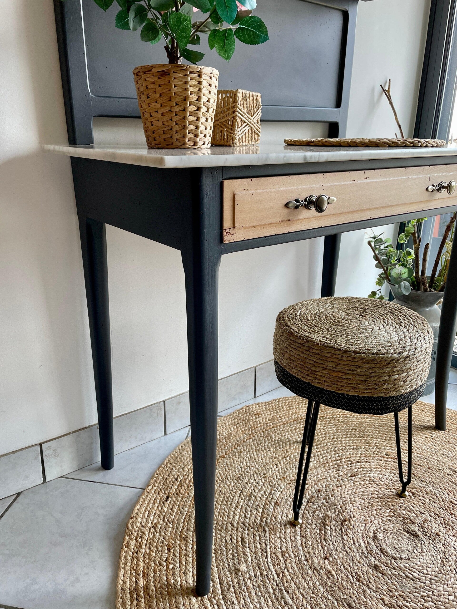 Console d’entrée remise au goût du jour dans un coloris actuel gris anthracite mat, mettant en valeur son marbre blanc au veinage gris.